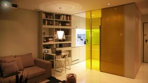 Idea drzwi przesuwnych to podstawowy pomysł aranżacyjny. Transparentna cytrynowa tafla oddziela kuchnię od salonu. Przestrzeń pokoju dziennego połączona jest z przedpokojem.