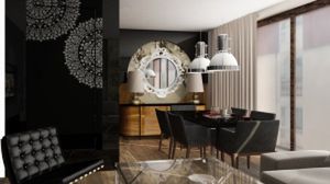 W tym salonie króluje orientalny przepych. Błyszczące płaszczyzny drzwi zostały pokryte złotymi wzorami. Niezwykłą malowaną ramę lustra i ciężkie meble z egzotycznego drewna zestawiono natomiast z chromowymi elementami i współczesnym designem (Barcelona Chair). Całość to niezwykła mieszanka współczesnej elegancji z azjatycką nutą.