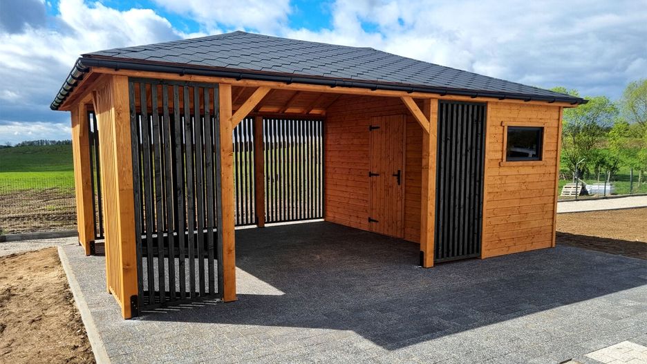 Świetnym rozwiązaniem jest także połączenie obu elementów w jednej konstrukcji – domku narzędziowego z altaną. To funkcjonalna konstrukcja ogrodowa typu 2w1, która łączy w sobie dwie przestrzenie: zamkniętą część magazynową przeznaczoną do przechowywania narzędzi, sprzętu ogrodowego lub rowerów, oraz otwartą altanę, służącą jako miejsce wypoczynku i rekreacji na świeżym powietrzu.