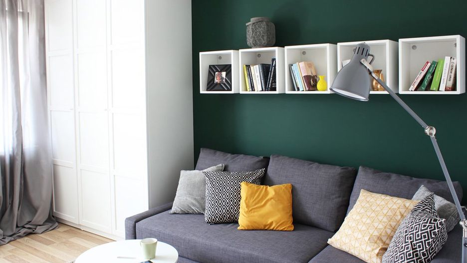 Retro akcenty pojawiły się również w przestrzeni kuchennej - na ścianach tuż nad blatem zamieszkały geometryczne płytki utrzymane w kolorystyce charakterystycznej dla lat 50. Oprócz tego zdecydowano się na dwa rzędy szafek kuchennych w kształcie litery L. Dolny rząd może pochwalić się białymi frontami, z kolei górny, ciemnozielonymi, które nawiązują tonacją do jednej z salonowych ścian. Dzięki temu, że we wnętrzach została zachowana ciągłość kolorystyczna, całościowa aranżacja prezentuje się niezwykle spójnie i harmonijnie. Oprócz tego warto zwrócić uwagę na praktyczny blat tuż pod kuchennym oknem - skoro w niewielkim wnętrzu nie zmieścił się stół, warto było postawić na nieco inne, równie funkcjonalne rozwiązanie!