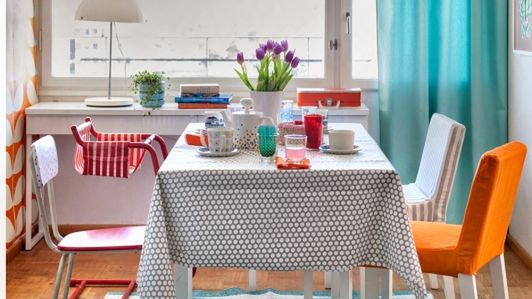 Kolorowo, prawda? Kontrastowe barwy, różne faktury i różne koncepcje. Wydawałoby się, że miękkie, obite krzesła nie dogadają się z twardym i surowym, niemal jak ze starej szkoły albo stołówki. A jednak. Do tego materiałowy fotelik dla dziecka i obrus w groszki. Od razu poprawia się nastrój.