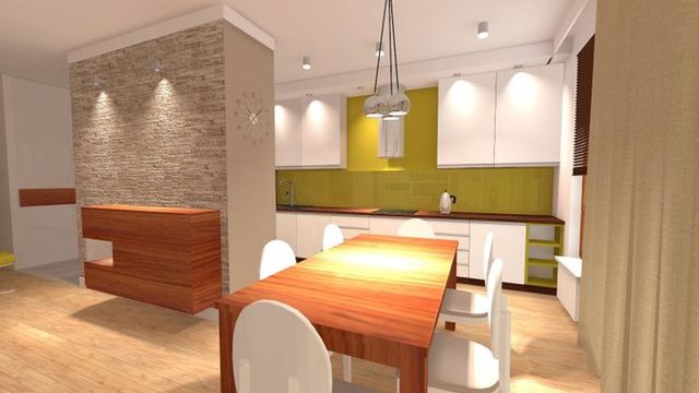 Wystrój białej kuchni został wkomponowany w przestrzeń otwartą mieszkania. Białe szafki z akcentem drewna na blacie i cokole, który nawiązuje do wystroju salonu. Żółty odcień ścian pokryty szkłem połączony jest z kolorem skrajnych szafek .