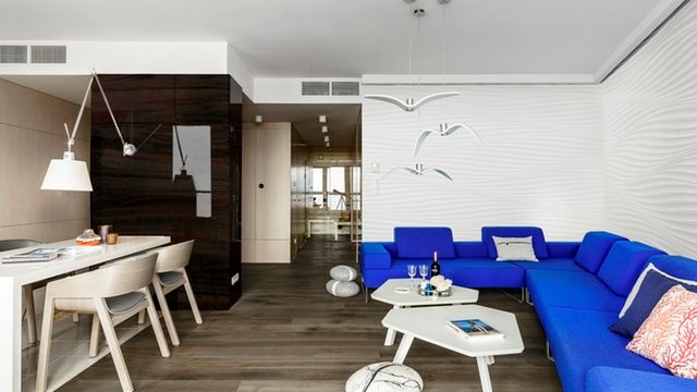 - Na 84 metrach kwadratowych nowoczesne wnętrza z wyraźnym nawiązaniem do stylu skandynawskiego mają kojarzyć się z pobliskim morzem - widocznym w przeszklonym salonie i kuchni. Zadanie to mają spełniać kolory, faktury, dekoracje. Dominują proste formy i gładkie powierzchnie - dodaje Paulina Kasprowicz. Kolorystyka została zawężona do bieli, jasnych beżów, delikatnych szarości oraz ciemnego brązu. Tą stonowaną paletę kolorów przełamuje intensywny błękit. W tym odcieniu jest duża, modułowa sofa w strefie dziennej oraz łóżka w dwóch sypialniach. Kolor ten ma kojarzyć się z morzem, podobnie jak faktura na ścianach w salonie - ich falista struktura przywodzi na myśl powierzchnię wody. Z kolei towarzyszące im lampy mają kształt mew. Gdzieniegdzie widoczne są również posrebrzane figurki statków. Nietypowym rozwiązaniem jest narożna sofa o kącie 70 stopni – pod takim kątem przebiega również jedna z zewnętrznych ścian apartamentowca.