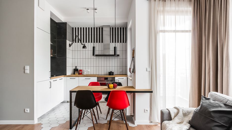 W kuchni silny graficzny akcent tworzą biało-czarne płytki marki Marrazzi. Podświetlona projektowana, czarna wisząca szafka z ażurowym siatkowym frontem nadaje kuchni loftowego charakteru. Taką samą siatkę zastosowano przy blacie łączącym aneks z salonem. Akcentem kolorystycznym są tu czerwone krzesła. Ciekawy dodatek stanowi także skórzany gazetownik zaprojektowany na zamówienie i wykonany na specjalne zamówienie u kuśnierza i ślusarza.