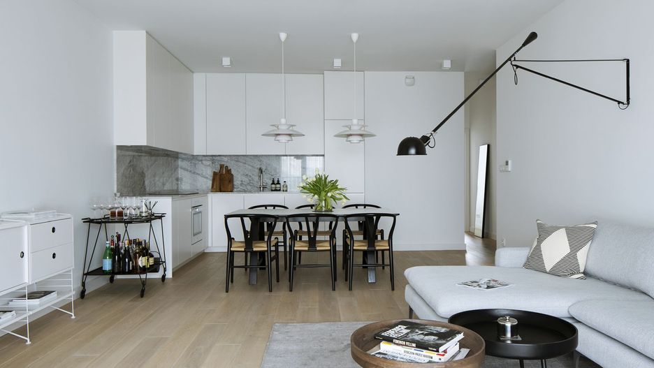 Lokatorzy zdecydowali się na nowoczesne połączenie kuchni z pokojem dziennym. Otwarcie wnętrza oraz zastosowanie bieli optycznie powiększyło przestrzeń. Co więcej, monochromatyczna zabudowa kuchenna w duecie z marmurem na ścianie nadaje pomieszczeniu klasy. Naturalny kamień wpisuje się w trend biophilic design, tak samo jak drewniana podłoga. Z kolei stół w towarzystwie krzeseł Whisbone Carla Hansena, przytula się do obu stref i pełni podwójną funkcję – jest miejscem spożywania posiłków oraz wygodnym aneksem jadalnym w salonie do przyjmowania gości. Nad nim umieszczono dwie lampy Louis Poulsen – będące subtelną ozdobą tej strefy.
