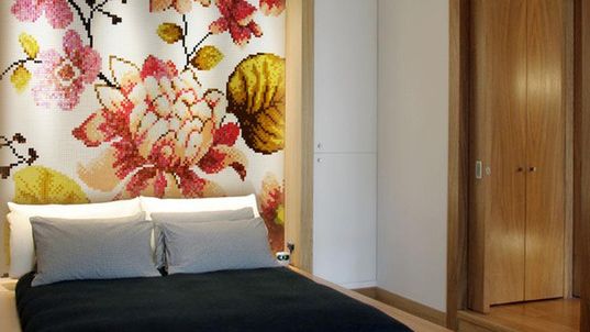 Te piękne kwiaty za zagłówkiem powstały właśnie z mozaiki. Z daleka jednak bardziej wyglądają na wyhaftowane. Górne oświetlenie eksponujące wzór sprawia, że sypialnia nie potrzebuje więcej dekoracji. Bez obrazu w tle byłaby pozbawiona wyrazu.