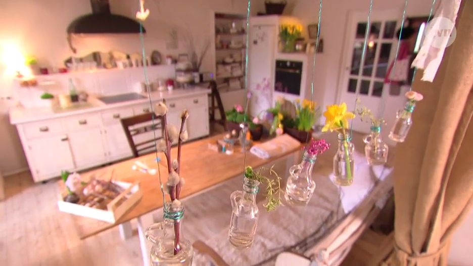 My pokazujemy jednakowe buteleczki po aromatach, ale wcale nie muszą być takie same. Możesz użyć dowolnych, byle tylko były w miarę podobnej wielkości i miały rant, żeby dało się je powiesić. Jak już masz buteleczki i drucik, reszta na pewno się znajdzie, choćby na spacerze. Rozejrzyj się za w miarę solidną gałęzią. Nie szukaj idealnej, właśnie taka trochę pokrzywiona ma swój niepowtarzalny urok. Do tego gałązka z kwitnącego drzewa, trochę bazi, żółty żonkil i jakaś zielenina. Zobacz, co z tym dalej zrobić.