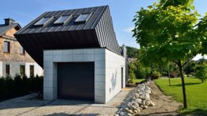 Garaż obłożony jest ciętym na gładko jasnoszarym piaskowcem, dobranym bez skaz i żółtych przebarwień, a pozostała część domu pokryta jeszcze szczelnie czarną blachą tytanowo-cynkową. Materiały obecne w sąsiadującej przestrzeni od ponad stu lat, zastosowane na domu nie budzą wątpliwości co do jego nowoczesnego i lekkiego charakteru.