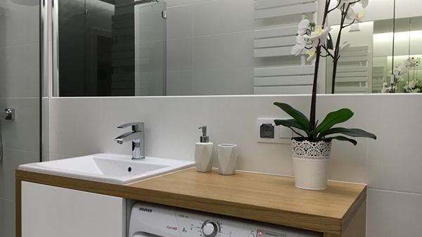 Właściciel łazienki miał bardzo konkretne oczekiwania. Przede wszystkim zależało mu na kabinie z odpływem liniowym zamiast wanny oraz na zaprojektowaniu przestrzeni pod pralkę, która nieco ją ukryje. Jak się okazało, to nie odpływ liniowy był wyzwaniem, ale ukrycie pralki pod blatem. Wiązało się to z podniesieniem całej umywalki o kilka centymetrów do góry, jak wiadomo - standardowo powinna ona kończyć się 85 cm od podłogi.