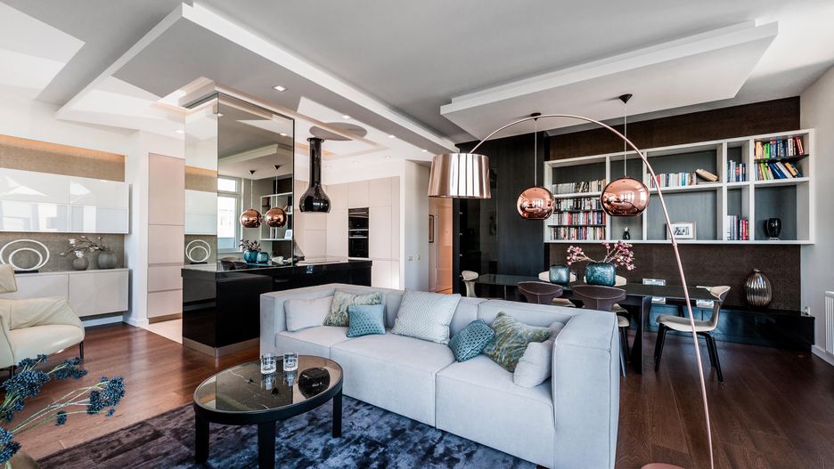 Nowoczesne, a zarazem eleganckie i ciepłe - takie miało być 93-metrowe mieszkanie w Gdyni zaprojektowane przez Artedizain dla młodego małżeństwa. We wnętrzach użyto kolorów kawy z mlekiem oraz brązu. Jest też czerń i akcenty w kolorze miedzi w postaci modnych lamp Toma Dixona. Salon urządzono nowocześnie.