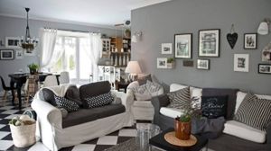 Gołębia szarość ścian i tkanin nadaje ton strefie dziennej. Wokół kawowych stolików komplet wypoczynkowy, suto okraszony wzorzystymi poduchami, przedstawia naprzemienny rysunek czerni i bieli. Szachownicę posadzki ocieplono w tym miejscu niewielkim puszystym dywanem w kolorze eleganckiego grafitu. Przytulną atmosferę buduje również nastrojowe oświetlenie. Klasyczna lampa przy fotelu tworzy zaciszny kącik na lekturę, a kinkiety o nieprzemijającej urodzie zapewniają kameralne oświetlenie boczne.