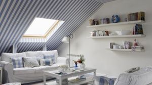 Pokój na poddaszu trudniej jest zaaranżować ze względu na skosy i mniejszą powierzchnię użytkową, dlatego niejednokrotnie kwestia estetyki schodzi w nich na dalszy plan, główną rolę odgrywa bowiem praktyczne zagospodarowanie przestrzeni pod skosami. W salonie na zdjęciu tę przeszkodę zmieniono jednak w zaletę. Skośna, wisząca nad głowami ściana przytłaczała wnętrze. Tapeta w pionowe paski, która swobodnie przechodzi ze ściany na sufit, optycznie powiększa i upiększa wnętrze. Motyw pasków kojarzy się ponadto z letnią markizą.