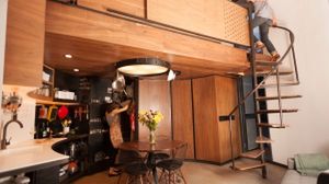 Do cylindrycznie ukształtowanej przestrzeni, której osią komunikacyjną są spiralne schody wiodące na antresolę, niełatwo było dobrać odpowiednie meble, bo jak tu ustawić szafę przy okrągłej ścianie? Dlatego też zaprojektowano je na wymiar, a warunkiem koniecznym były zaokrąglenia, wyoblenia i brak ostrych kantów.
