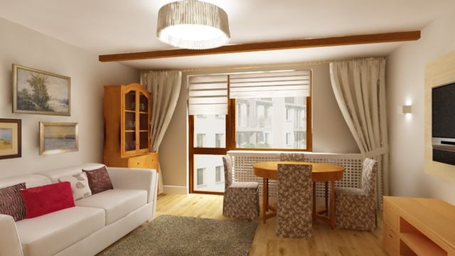 Konieczność zachowania w projektowanym wnętrzu starych mebli, wyglądającym dość topornie i w kolorze dość zobowiązującym, było dość dużym utrudnieniem. Meble zostały rozstawione od siebie dzięki czemu pokój zyskał na lekkości. Wstawienie jasnej kanapy i zmiana kolorów ścian na jasne neutralne kolory pozytywnie wpłynęły na panujący tu klimat.
