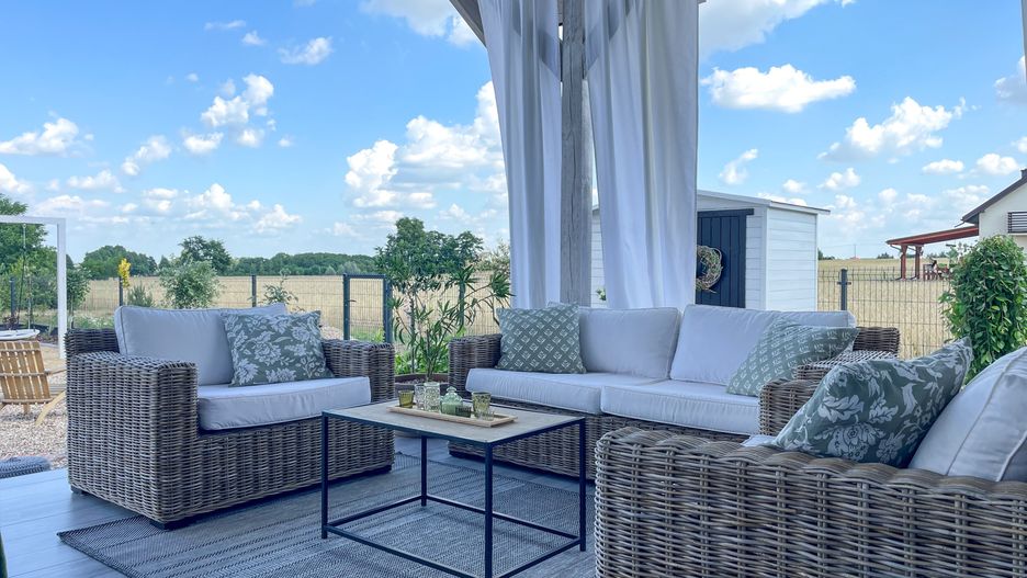 Mała łazienka dla gości została zaaranżowana w klasycznym stylu. Harmonię wprowadzają tu ścienne płytki z kolekcji Timeless Macieja Zienia, które zostały uzupełnione szarością Wood Craft Grey na podłodze. Charakter wnętrzu nadają dodatki - obrazki w drewnianych ramkach oraz czarne lustro i bateria. Wrażenie robi też taras, gdzie na podłodze zostały położone płytki Korzilius Wood Craft Grey takie same, jak we wnętrzu domu. Z tą różnicą, że w salonie są ułożone w jodełkę, a na zewnątrz - prosto. Przytulność gwarantują tekstylia w stylu farmhouse i boho - rattanowe osłonki, latarnie i hamak.