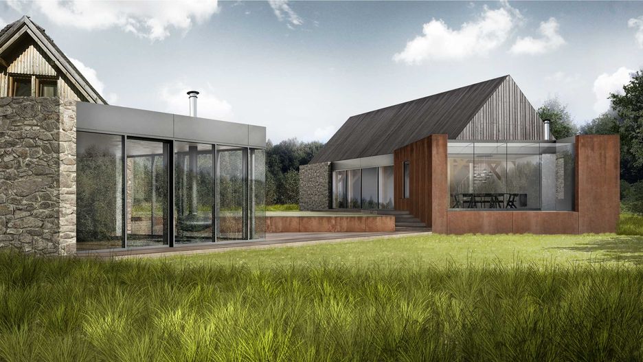 Działka była kiedyś gospodarstwem rolnym, nawiązaliśmy do typowej dla tych terenów zabudowy zagrodowej. Zazwyczaj w takim kompleksie oprócz domu były budynki gospodarcze, stodoła, obora, chlew. W projekcie podzieliśmy funkcje między kilka obiektów. Główny służy jako część mieszkalna, z wysokim salonem otwartym na ogród, sypialniami w prywatnej części. W dawnej stodole urządzone będzie domowe centrum wypoczynku, dużą część wnętrza zajmuje basen, zaplanowaliśmy też przestrzeń dla gości.