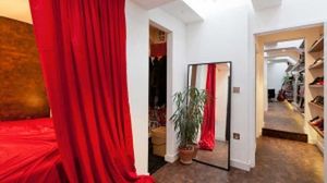 Za kuchnią umieszczono sypialnię, garderobę i łazienkę. Ta część mieszkania stanowi efektowne master-bedroom. Wszystkie strefy są dobrze pomyślane pod względem użytkowym. Wnękę, w której Laura zaprojektowała łóżko, oddzielono od pozostałych wnętrz czerwoną kotarą dodająca wnętrzu barwy i tajemniczości. Lustra odgrywają w mieszkaniu ważną rolę, powiększając je optycznie i odbijając światło.