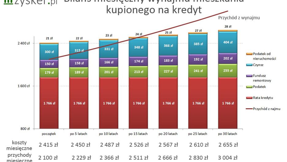 Podsumowując, roczne koszty wyniosą około 29 tys. zł (kredyt + opłaty mieszkaniowe + podatek 8,5 proc.). W kolejnych latach będą one nieznacznie wyższe ze względu na inflację (w przypadku opłat mieszkaniowych – 1 proc.) oraz dodatkowego podatku od rosnących dochodów z wynajmu. W trzydziestym roku inwestycji osiągną poziom ok. 32 200 zł.