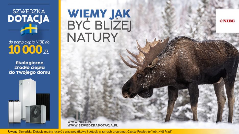Już 2 marca 2020r. rozpocznie się kolejna edycja Szwedzkiej Dotacji do pomp ciepła NIBE do 10 000 zł. Jeśli marzysz o czystym, energooszczędnym i komfortowym systemie grzewczym, skorzystaj ze wsparcia do 5 000 zł do pompy ciepła, do 6 000 zł do pompy ciepła wraz z rekuperatorem NIBE ERS lub GV-HR, do 9 000 zł na zakup pompy ciepła z zestawem paneli fotowoltaicznych NIBE PV. Dotację w wysokości 10 000 zł można otrzymać na zakup pompy ciepła, rekuperatora oraz zestawu paneli fotowoltaicznych NIBE PV. Szwedzką Dotację marki NIBE można łączyć z ulgą podatkową oraz dotacją w ramach programu NFOŚiGW "Czyste Powietrze" lub "Mój Prąd".