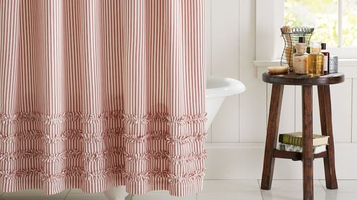 Zasłonka prysznicowa może się wyróżniać nie tylko kolorem i wzorem, ale także oryginalnym kształtem i wykończeniem. Stylowa zasłonka z podwójną falbaną przypomina długą spódnicę lub fantazyjną aranżację okienną. Dzięki takim skojarzeniom będzie pasować do romantycznej łazienki w stylu retro. Jako oryginalny dodatek wykorzystaj starą miednicę oraz druciane koszyki.
